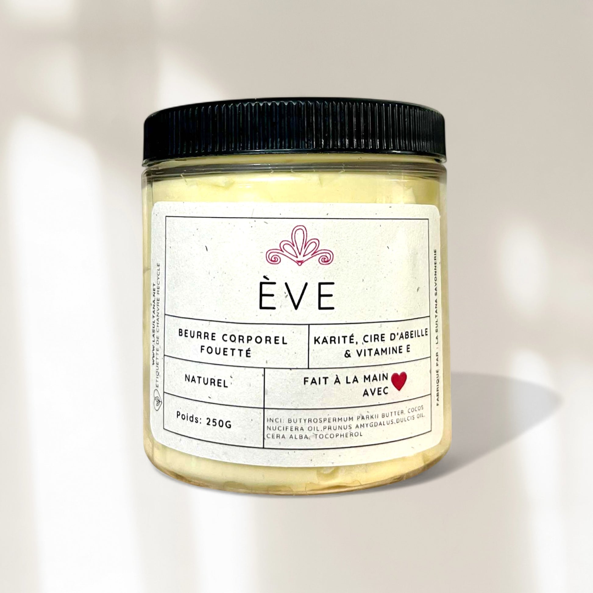 Le beurre corporel fouetté naturel et artisanal au karité Eve est un véritable élixir! Il hydrate, lisse et régénère votre peau.