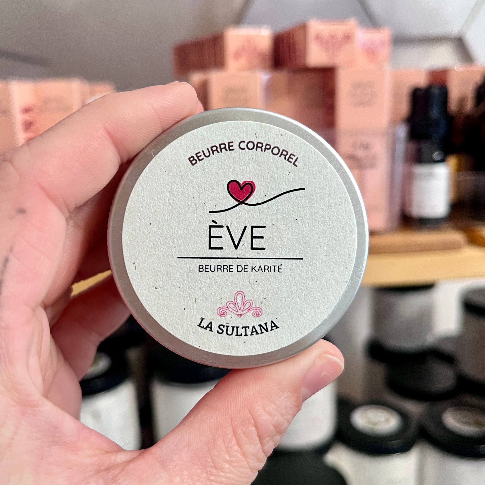 - Avec son ajout de cire d'abeille et de vitamine E , le beurre corporel Eve est parfait pour les peaux déshydratées et les peaux qui ont tendance à avoir de l'eczéma. Délicate odeur de coco et de karité naturel.