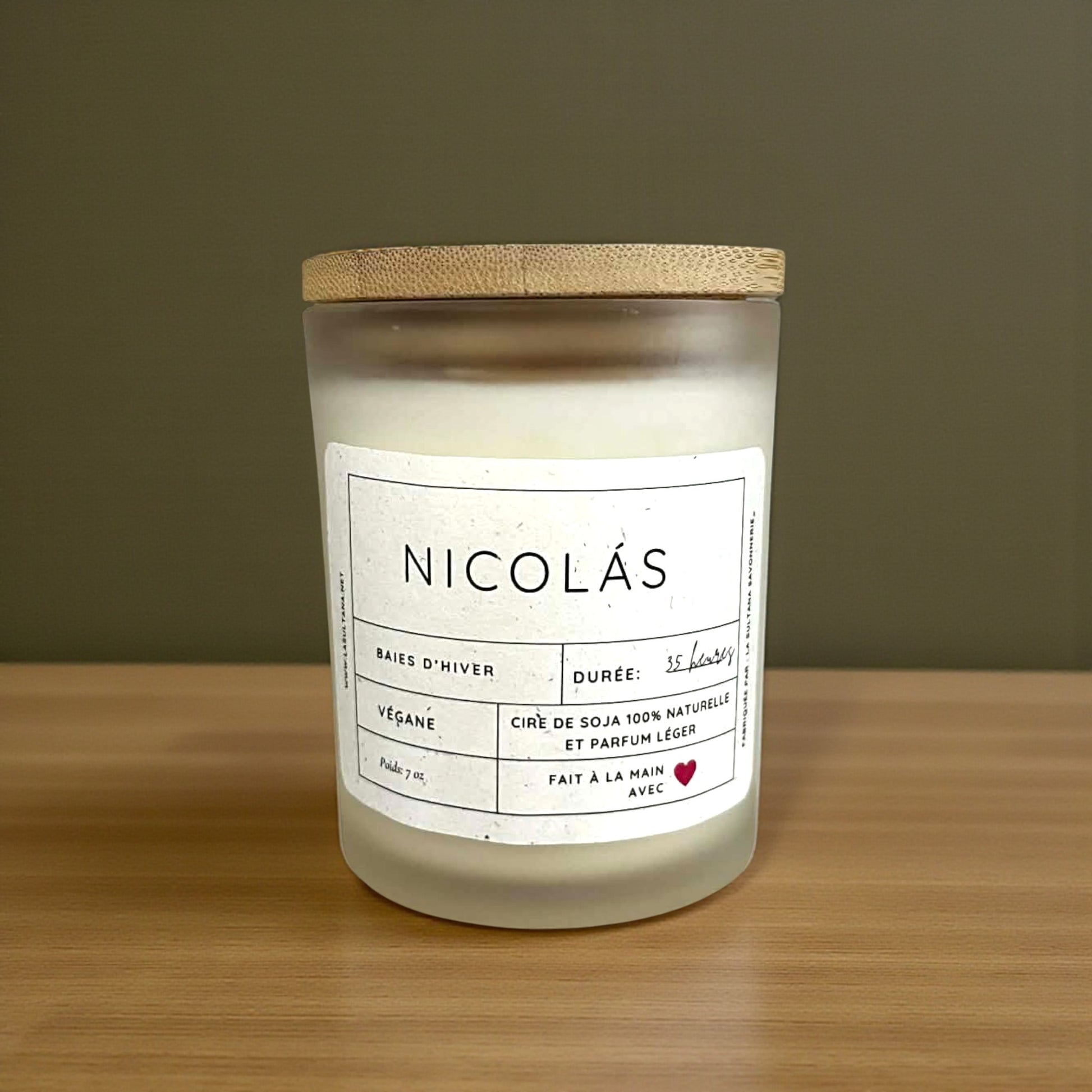 Nicolás est une bougie composée de cire de soja 100% naturelle, est tout simplement réconfortante durant les journées d'hiver et non toxique.