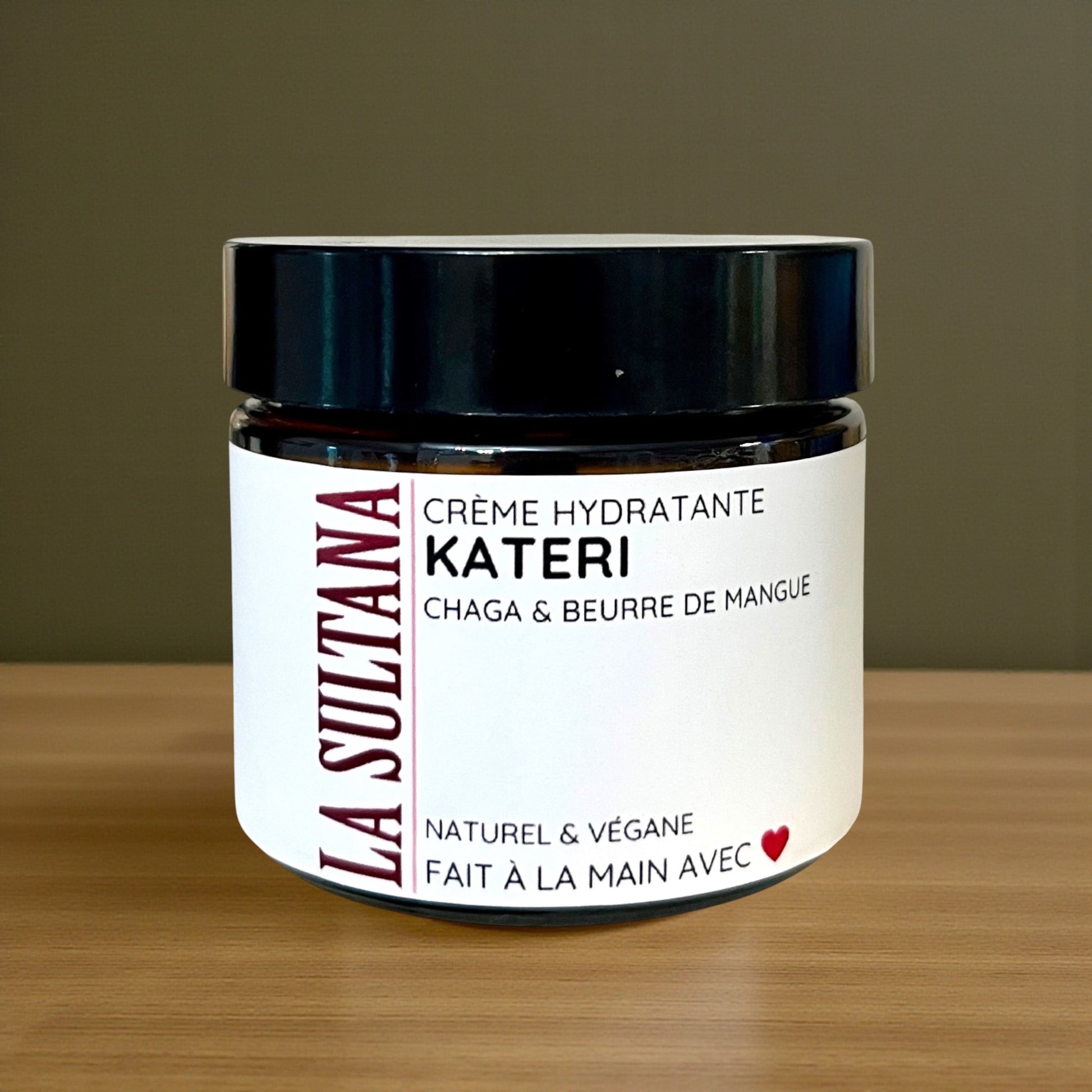 La crème hydratante végane Kateri, composée d‘extraits de champignons Chaga canadiens, est un soin luxueux enrichi en beurre de mangue, huile d’avocat et beurre de karité.