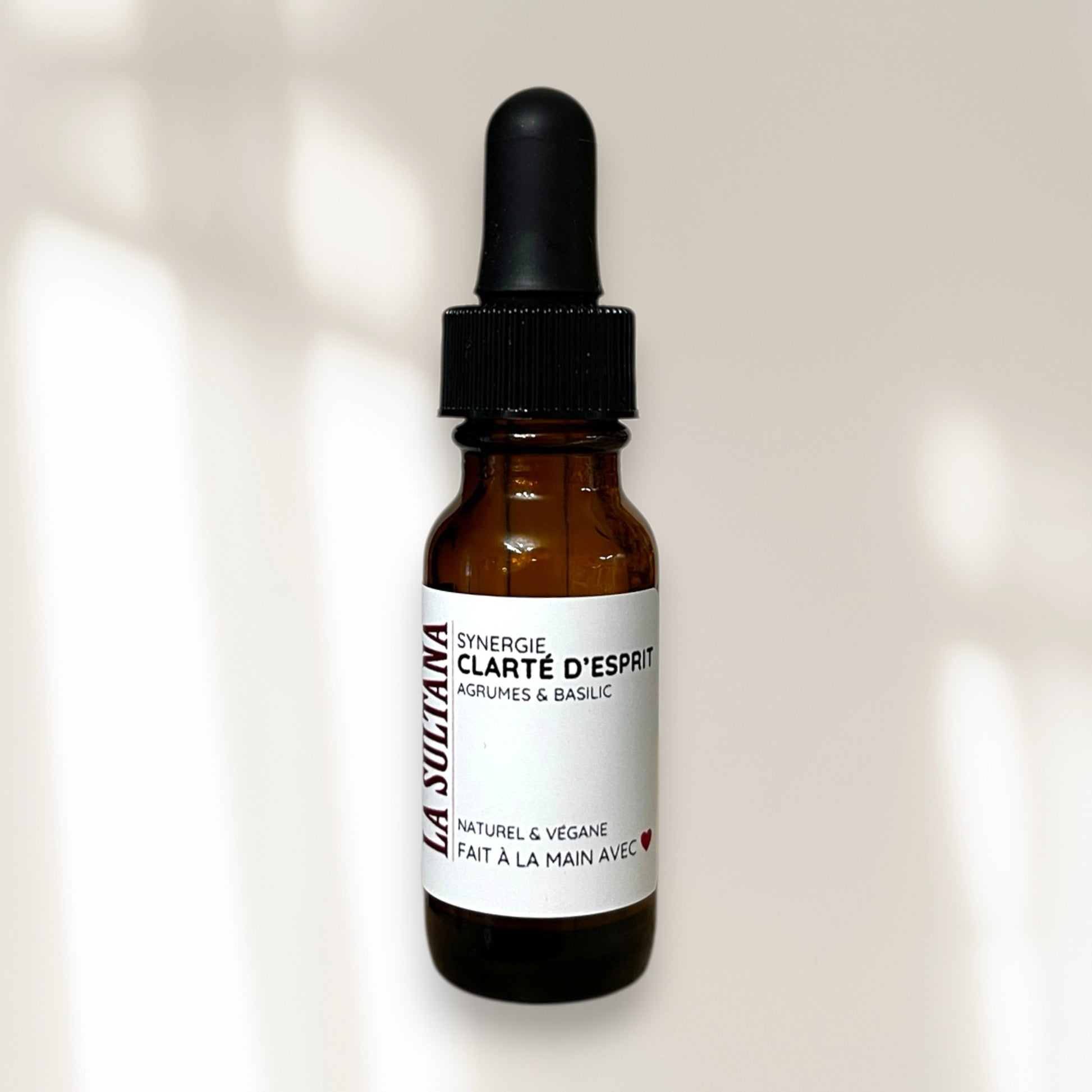 Composée d’huiles essentielles de pamplemousse, de bergamote, de basilic et de citron, cette synergie est idéale pour stimuler la concentration et la vivacité d’esprit.